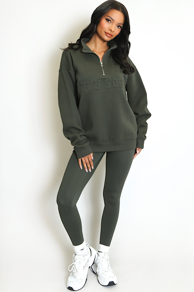Khaki NEW YORK Zip Slogan Sweatshirt