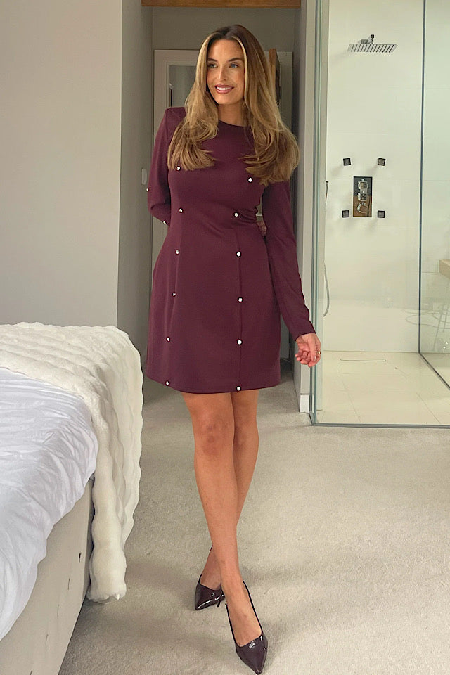 The Morrigan Studded Long Sleeve Mini Dress in Plum features an effortlessly classic and elegant silhouette enhanced by diamanté stud details. Its flirty mini length adds a touch of playful sophistication, making it ideal for stylish occasions where refined charm is key.