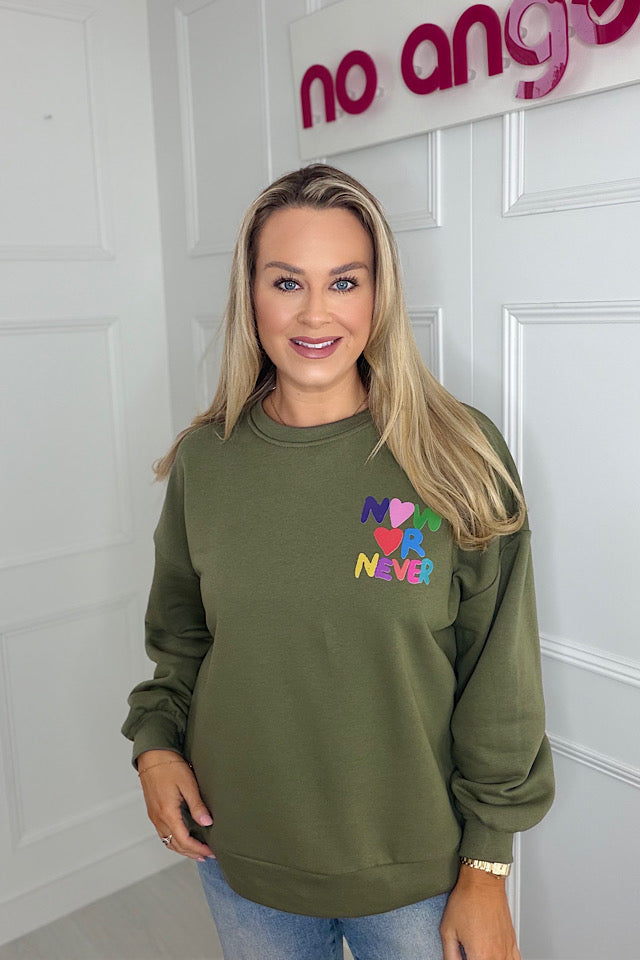NOW OR NEVER Back Slogan Sweatshirt In Khaki