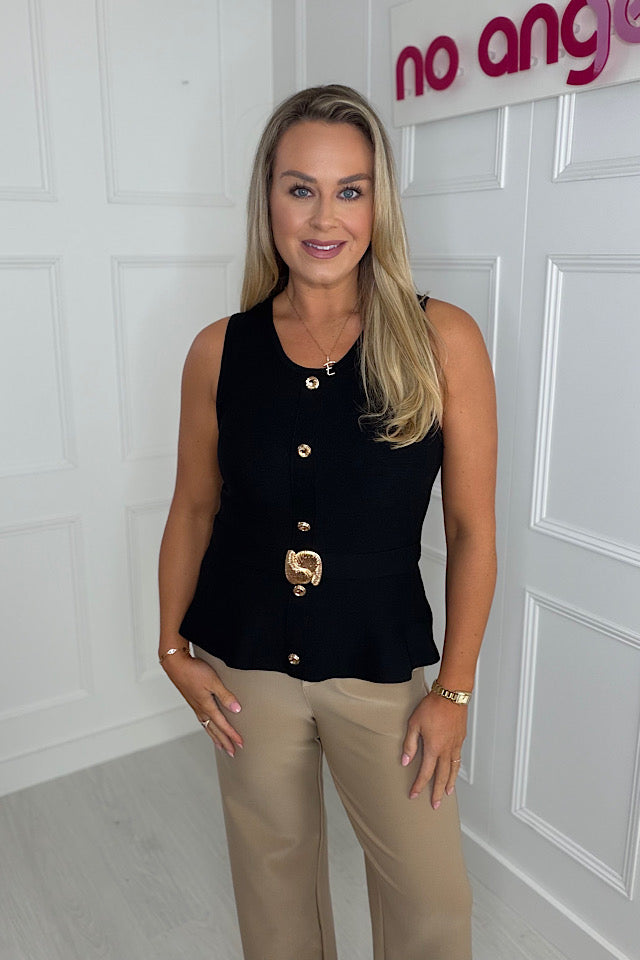 Penelope Peplum Top In Black With Gold Detail